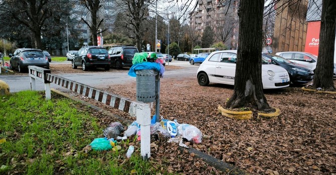Dopo le prime segnalazioni, la situazione non cambia: foglie, cestini stracolmi e rifiuti. La partecipata conferma di non avere competenza sullo spazio, che ora vive nel limbo del passaggio di consegne in attesa dell'apertura di Eurospin