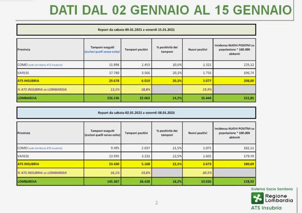Il primo dato che emerge è quello relativo al monitoraggio settimanale sul contagio, che ancora indica un'espansione dell'epidemia, con una crescita di nuovi casi anche se per ora non esponenziale. Da sabato 9 gennaio a oggi in provincia di Varese sono stati eseguiti 17.780 tamponi che hanno individuato 1.756 nuovi positivi, con un'incidenza di 196,74 nuovi casi ogni centomila abitanti. Nella settimana precedente, quella dal 2 all'8 gennaio, i nuovi positivi erano stati 1.602 con 13.935 tamponi e l'incidenza di 179,49. Una crescita quindi che si aggira intorno al 10% sui sette giorni precedenti.