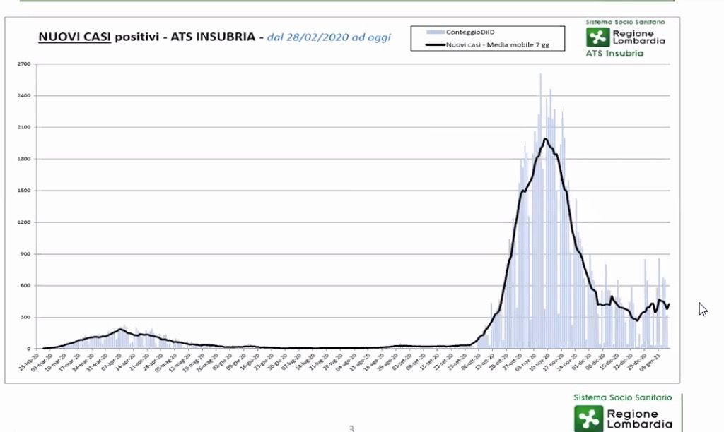 «L'indice di contagio Rdt tende ad aumentare - ha spiegato il direttore sanitario di Ats Insubria, Giuseppe Catanoso - ed è probabile che questo incremento sia dovuto ai comportamenti assunti in zona gialla prima delle vacanze di Natale, dal periodo delle feste e alla tranquillità fornita dall'inizio delle vaccinazioni. Atteggiamenti che hanno fatto abbassare la soglia di attenzione, ma bisogna considerare che per la maggior parte della popolazione il vaccino arriverà dopo l'estate. Fino all'immunità di gregge non si può abbassare la guardia. Lo dico soprattutto ai tanti giovani che continuano a non rispettare il distanziamento».