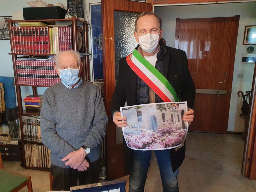 Il primo cittadino ha donato al festeggiato una lettera dell’amministrazione e una targa: «L’anno prossimo non so se sarò ancora sindaco – ha scherzato –. In quel caso, ci rivediamo per i 101 anni».
