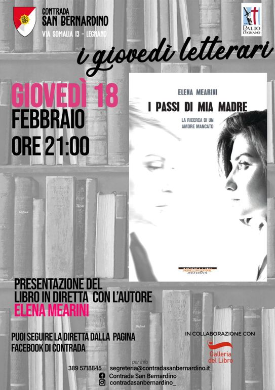Nel primo appuntamento di giovedì 18 febbraio, l'autrice legnanese, Elena Mearini, presenterà il suo romanzo "I passi di mia madre" che parla del convivere con un'assenza: nel caso di Agata, editor milanese, quella della madre, andata via di casa molti anni prima. Oggi Agata colma la mancanza con il cibo e amori sbagliati, ma arriva il momento di scoprire cosa è successo alla donna che l'ha abbandonata senza nemmeno un saluto...
