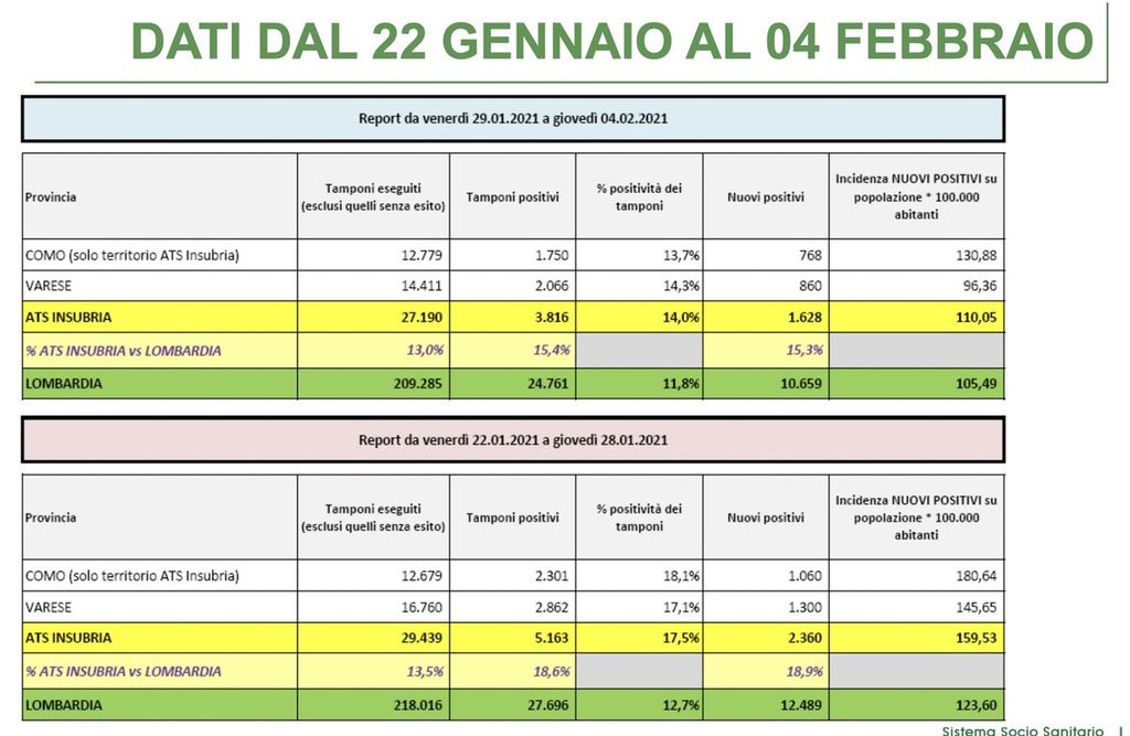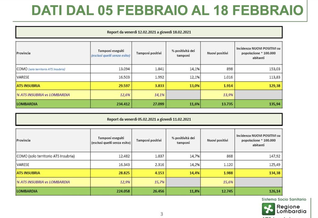 Per quanto riguarda il Varesotto, infatti, nell'ultima settimana, quella da venerdì 12 a giovedì 18 febbraio, sono stati 16.503 i tamponi eseguiti e 1.016 i nuovi positivi accertati con un'incidenza di nuovi positivi ogni centomila abitanti pari al 129,38. Nei sette giorni precedenti la crescita era stata di 1.120 positivi mentre i tamponi erano stati pressoché gli stessi, ovvero 16.343, e l'incidenza si attestava al 125,49. Un calo della crescita intorno al 10%.