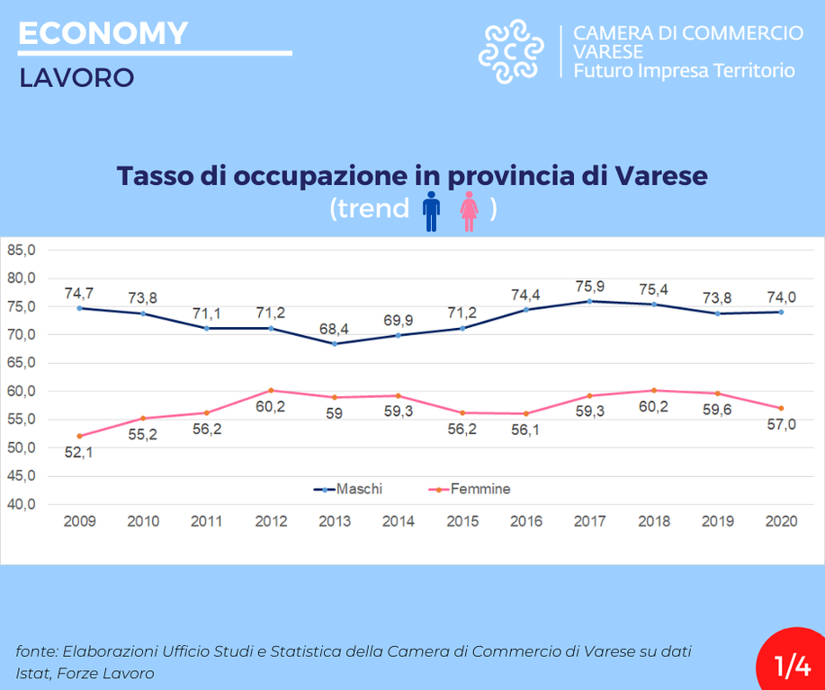 Il numero degli inattivi è così cresciuto da 164mila a 173mila con un incremento del tasso di inattività, passato dal 29,4% al 31%.Paradossalmente, il tasso di disoccupazione provinciale scende allora dal 5,4% al 4,9%, evidenziando la stessa dinamica che si registra a livello regionale (dal 5,6% al 5%) e nazionale (dal 10% al 9,2%) ma non è da leggersi come un segnale incoraggiante. Nel 2020, in provincia di Varese, sono oltre 19mila le persone in cerca di occupazione, di cui 9mila uomini e 10mila donne. Entrando ulteriormente nel dettaglio dei dati, si evidenzia che, almeno per il momento, sono le donne quelle che stanno subendo gli effetti della crisi: le occupate calano da 171mila a poco più di 162mila e, parallelamente, il tasso di occupazione femminile scende dal 59,6% al 57%. Una cifra che risulta sotto la media lombarda (59,3%), ma ancora decisamente superiore a quella italiana (49%). Come già più volte evidenziato, le donne stanno evidenziando problemi occupazionali poiché maggiormente occupate nei settori e nelle professioni più colpiti dalla crisi (turismo, ristorazione, commercio e servizi in genere), poiché più spesso impiegate con contratti a termine e maggiormente esposte ai problemi legati alla conciliazione tra tempi di vita e di lavoro, che si sono acuiti nell’ultimo anno.