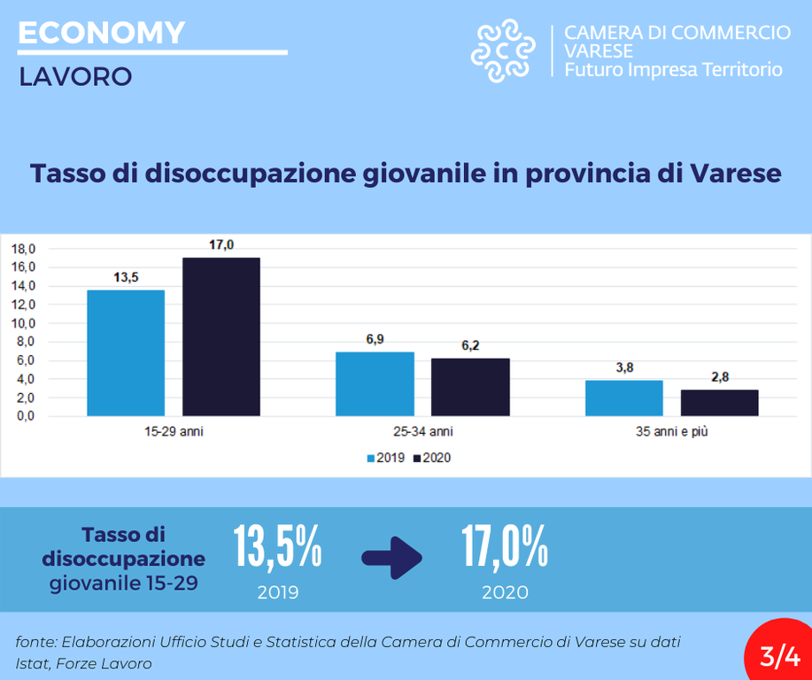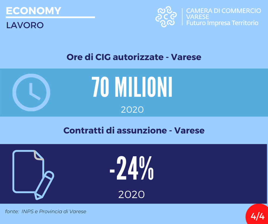 Probabilmente per effetto delle misure messe in campo dal Governo, l’occupazione maschile a livello provinciale rimane invece stabile, con un tasso di occupazione pari al 74% (74,3% il dato lombardo e 67,2% quello nazionale).In generale, risultano penalizzati anche i giovani dai 15 ai 29 anni, spesso impiegati con contratti a termine o atipici e meno tutelati, che vedono salire il livello di disoccupazione al 17% dal 13,5% del 2019, superando la media lombarda (13%) ma rimanendo ampiamente al di sotto del dato italiano (22%). Parallelamente è diminuita l’occupazione giovanile, che è scesa dal 38% al 35,6% (38,2% a livello lombardo e 29,8% a livello nazionale).In provincia di Varese sono, poi, i lavoratori indipendenti a registrare una variazione negativa più marcata in termini percentuali: -5,1%, con quasi 4mila occupati in meno, mentre i dipendenti registrano un -1,8%, pari a poco meno di 5.500 persone. Infine, sono 70milioni le ore di cassa integrazione autorizzate totali lo scorso anno (per dare un termine di confronto, furono 53 i milioni durante la crisi finanziaria del 2009) mentre le assunzioni si sono ridotte del 24%: gli avviamenti al lavoro registrati dai Centri per l’Impiego della provincia di Varese sono diminuiti dagli oltre 116mila del 2019 ai meno di 88mila nel 2020, a testimonianza di una frenata sostanziale del turn-over e della mobilità dei lavoratori.