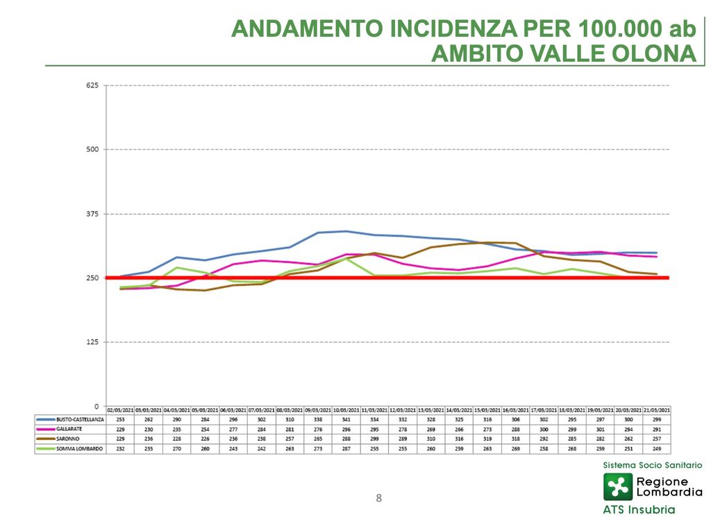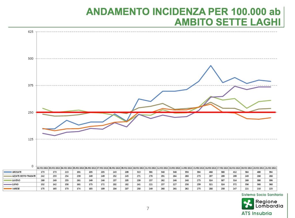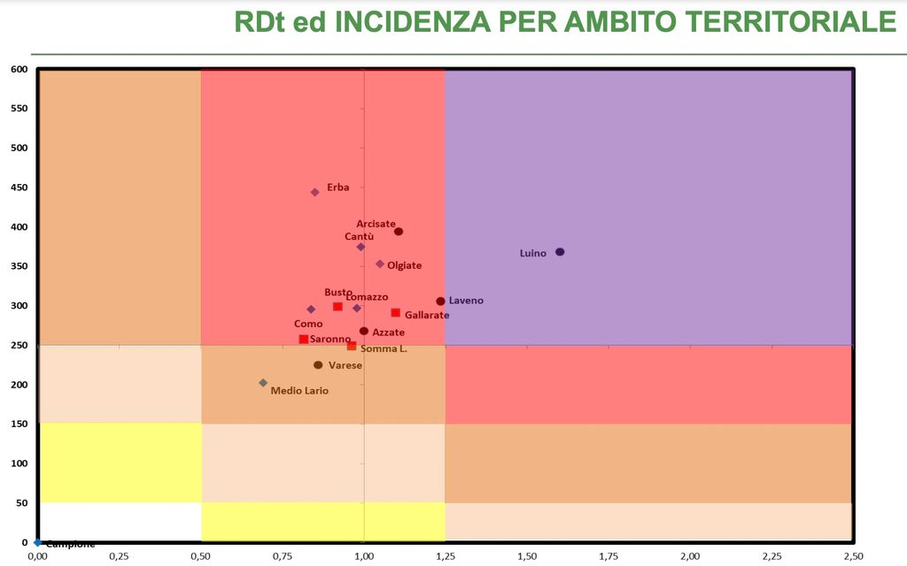 Si tratta dello stesso parametro che il governo utilizza per le chiusure della zona rossa e che individua nel valore di 250 la soglia limite. Ecco i dati diffusi sempre da Ats Insubria e suddivisi per ambiti territoriali.