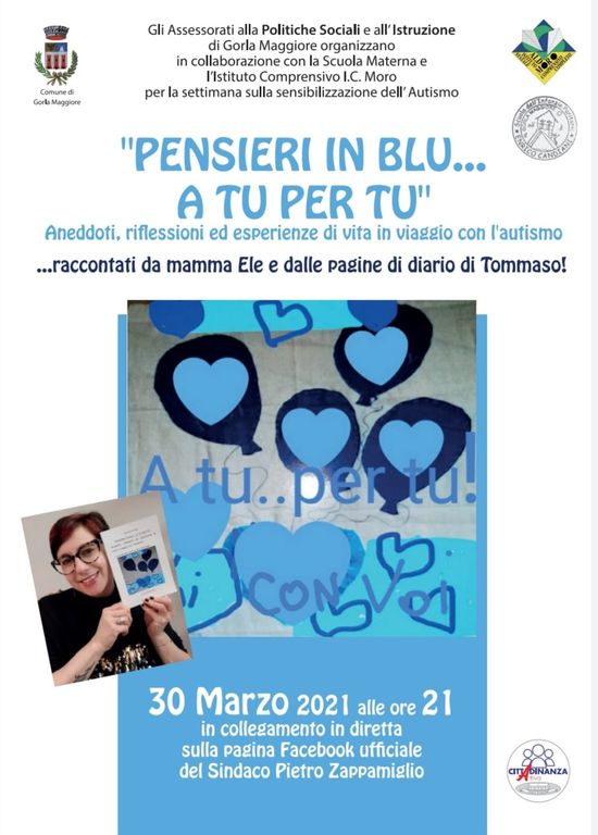 In occasione della settimana sulla sensibilizzazione dell’autismo gli assessorati alle Politiche Sociali e all’Istruzione di Gorla Maggiore, in collaborazione con la Scuola Materna “Enrico Candiani” e l’Istituto Comprensivo “Moro” presentano “Pensieri in blu... a tu per tu”.