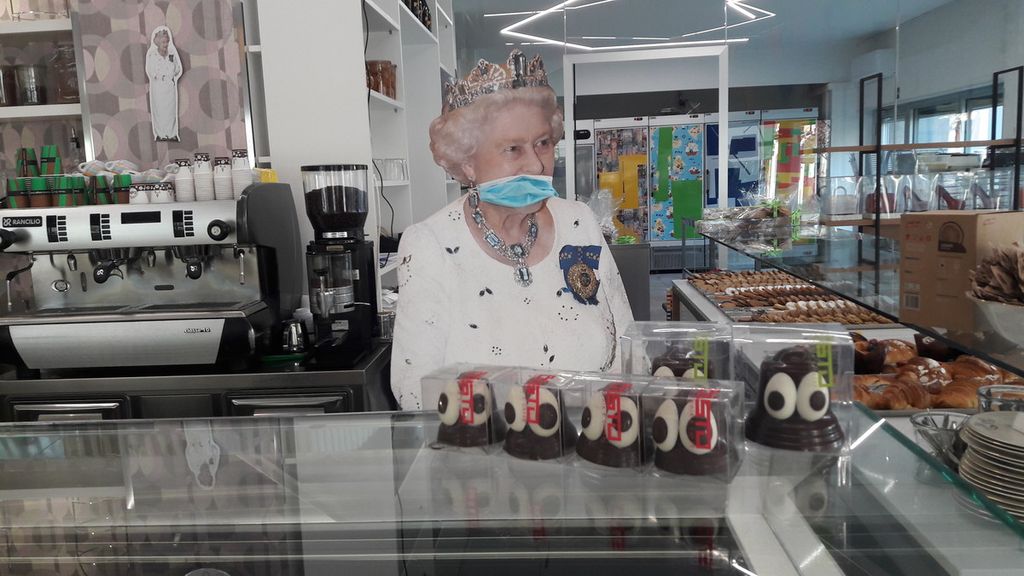 Dietro al bancone si può trovare una "collaboratrice d’eccezione" (già, la Regina Elisabetta in sagoma) con una mascherina indossata non proprio a regola d’arte. E il titolare, Graziano Bistoletti.