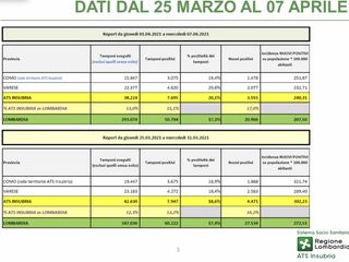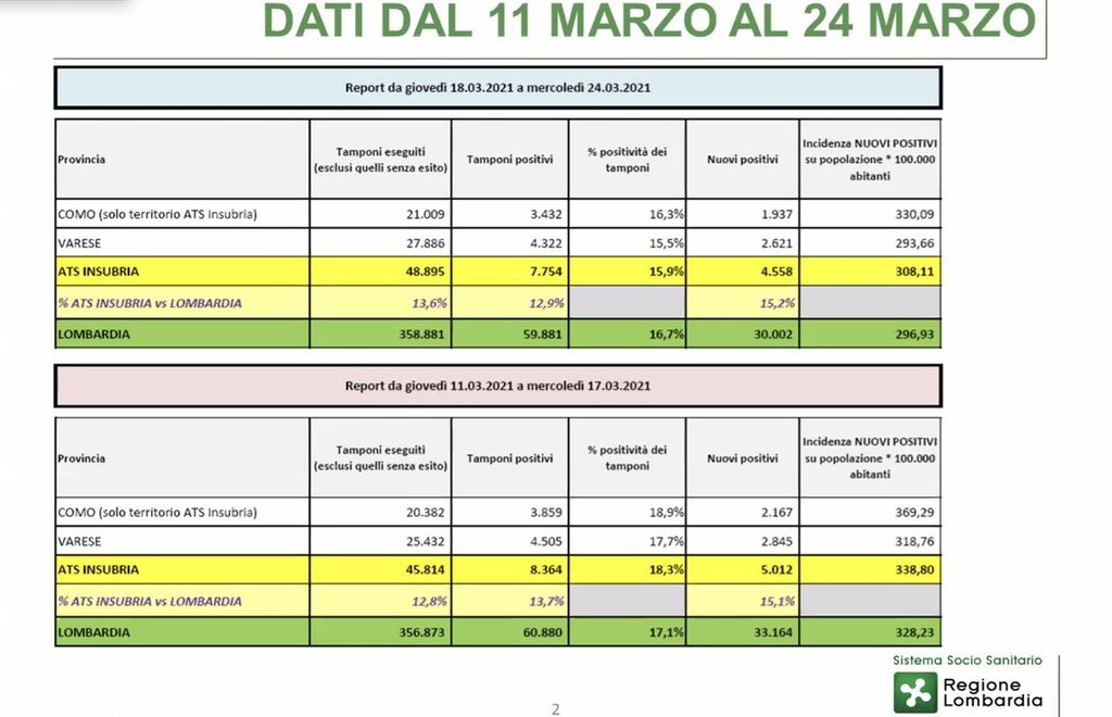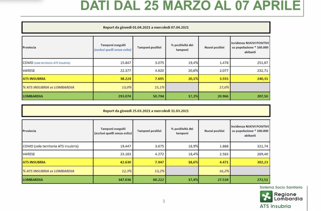 I numeri dell'ultima settimana parlano di un calo dei contagi. In provincia di Varese, ad esempio, dal 1° al 7 aprile sono stati eseguiti 22.377 tamponi che hanno individuato 2.077 nuovi positivi per un'incidenza di 232 ogni centomila abitanti. Nei sette giorni precedenti, quelli tra il 25 e il 31 marzo, i tamponi erano stati 23.183 con 2.583 positivi accertati per un'incidenza di 289.