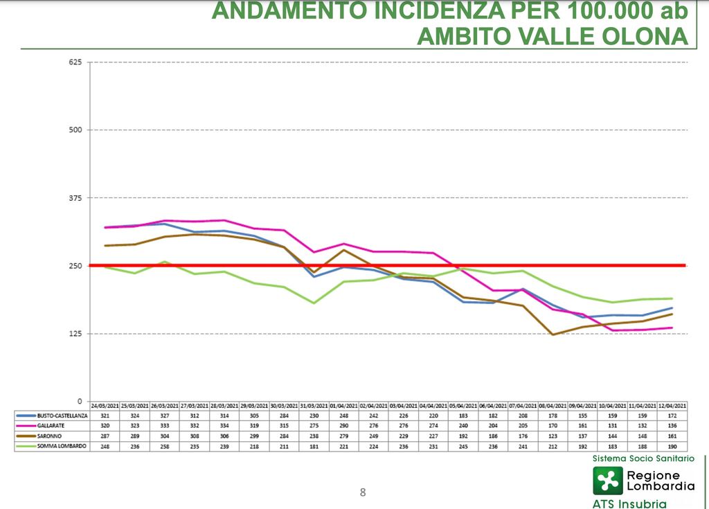 Per quanto riguarda il sud del Varesotto si consolida il netto ribasso iniziato già la settimana scorsa. Nell'ambito di Busto Arsizio - Castellanza l'incidenza al 12 aprile era di 172, in lieve ulteriore discesa rispetto ai 183 di sette giorni prima.