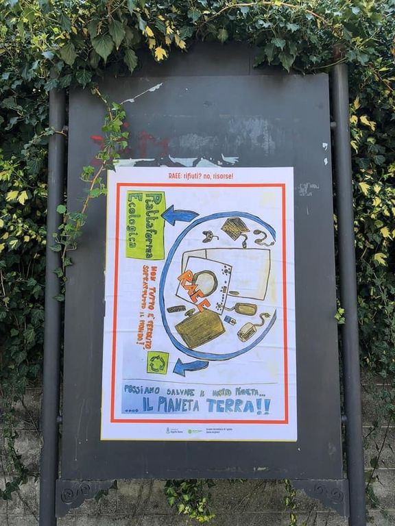 Sui diversi cartelli che spiegano come i RAEE (rifiuti di apparecchiature elettriche ed elettroniche) siano una risorsa preziosa, da riciclare e non da disperdere nell’ambiente, sono raffigurati i disegni dei ragazzi di Olgiate.