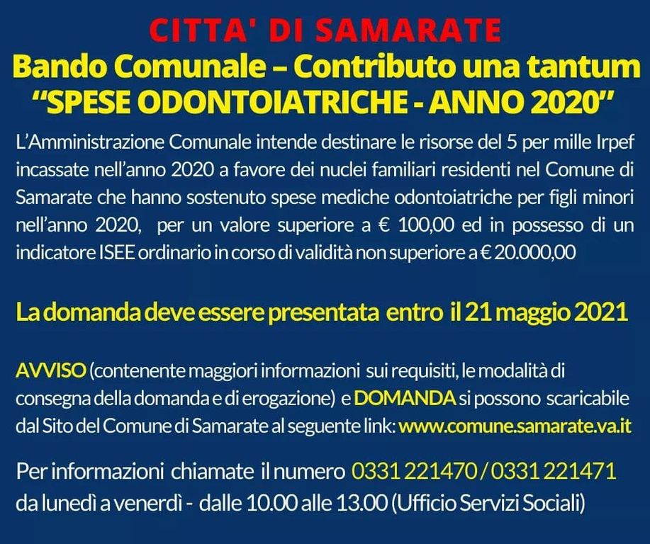 «Su segnalazione delle nostre assistenti sociali – riprende la vicesindaco Alampi - abbiamo pensato di destinare l'importo ricevuto nel 2020 alle spese odontoiatriche sostenute dalle famiglie per la salute dei denti dei figli minori. La modalità del “Bando” ritengo sia lo strumento più efficace e trasparente per permettere alla cittadinanza di poter partecipare».