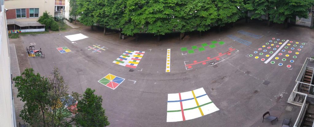 Sono molti i giochi che sono stati ricreati su misura e successivamente dipinti al suolo, dal twister al gioco della campana, dai quadri colorati su cui saltare agli spazi destinati ad esercizi e giochi a corpo libero. Si è rivelato fondamentale anche l’aiuto di genitori ed insegnanti che si sono prestati ai lavori di organizzazione dello spazio e stesura dei colori.