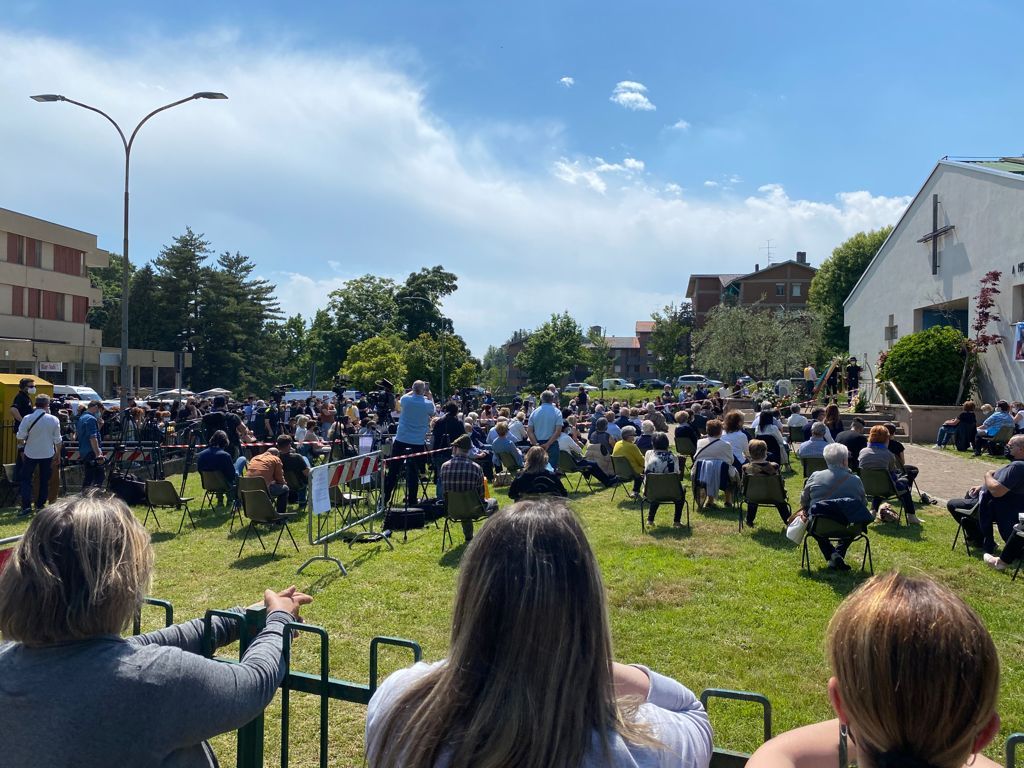 Volontari della protezione civile e la presenza, discreta, delle forze dell'ordine sono all'esterno della chiesa insieme alle telecamere di tutte le tv nazionali ed estere, anch'esse sistemate a distanza in modo da non recare il minimo disturbo allo svolgimento della cerimonia.