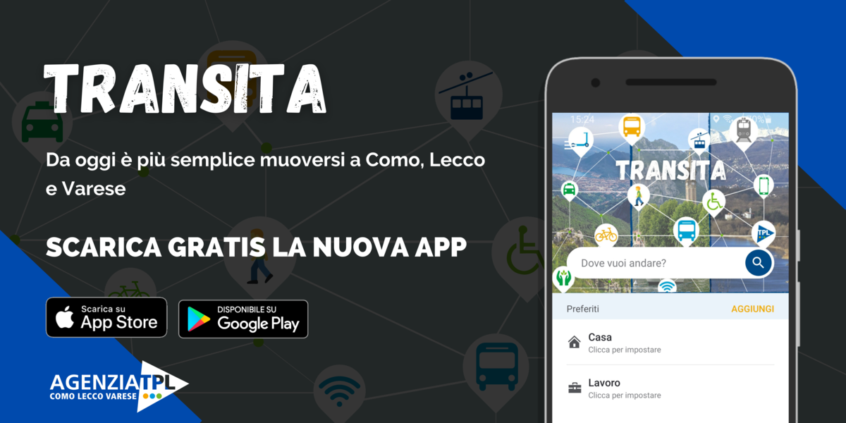 La nuova App TRANSITA si inserisce nel percorso di digitalizzazione dell’Agenzia, volto a migliorare l’esperienza di viaggio degli utenti del sistema di trasporto pubblico e rendere le città del nostro territorio più accoglienti per i cittadini e i turisti. È questo l’obiettivo dell’Agenzia TPL di Como, Lecco e Varese - l’ente pubblico che programma e monitora i servizi degli autobus di linea urbani ed extraurbani delle province di Como, Lecco e Varese e gli impianti a fune non turistici del territorio – che, con lo sviluppo di TRANSITA, compie un passo in più verso il futuro di una mobilità integrata, inclusiva e sostenibile, orientata al Mobilty as a Service (MaaS), cioè alla mobilità come servizio omnicomprensivo che permette agli utenti di spostarsi in modo veloce, sicuro e conveniente con tutti i mezzi di trasporto a disposizione.