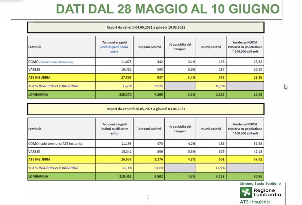 Partendo dai contagi il monitoraggio evidenzia come la crescita sia ancora in calo, con una riduzione di oltre il 30% di casi in una settimana. In provincia di Varese dal 4 giugno a oggi sono stati analizzati 16.432 tamponi, che hanno individuato 237 nuovi positivi. Nei sette giorni precedenti i tamponi erano stati 15.342 con 376 casi individuati.