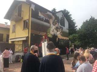 «Questo dipinto ora appartiene a voi, non a un muro». A Lonate Pozzolo, a questo territorio, all'umanità. Le parole di Andrea "Ravo" Mattoni raggiungono la folla che ha voluto assistere all'inaugurazione di questo affresco in un caldo pomeriggio di giugno. Di più, questa folla rappresenta tutti coloro che hanno seguito la creazione di questo angelo dell'Annunciazione di Leonardo nei giorni scorsi e ne sono stati a loro modo artefici. Perché c'è stato un dialogo incessante con Ravo, compresi - anzi, a partire da - i bambini.