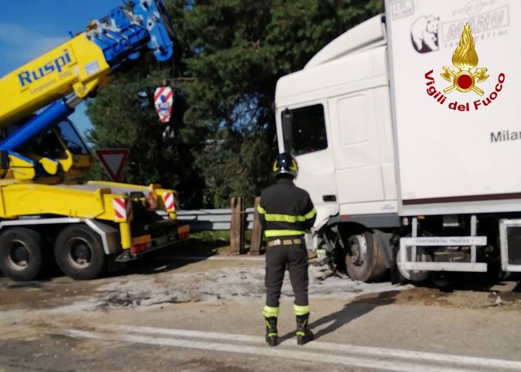 FOTO. Mezzo pesante "perde" ruspa in autostrada: schianto con un altro camion sul raccordo A8/A26
