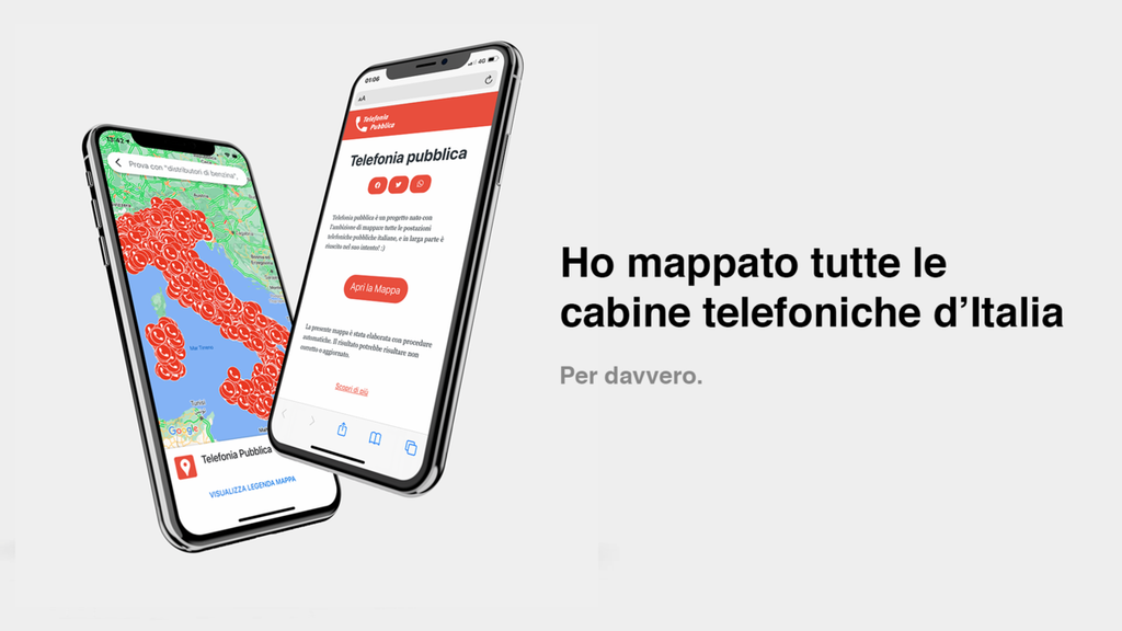 Da questo primo esperimento, svolto manualmente, con il passare del tempo si è evoluto un progetto più ampio. Attraverso l’utilizzo di diversi strumenti e linguaggi informatici ha portato alla realizzazione di un sito che al suo interno contiene la mappatura di tutte le cabine telefoniche situate sul suolo italiano. Per farlo, però, è stato necessario utilizzare come base gli elenchi forniti dall’azienda telefonica, che non possono essere ridistribuiti senza il suo permesso.