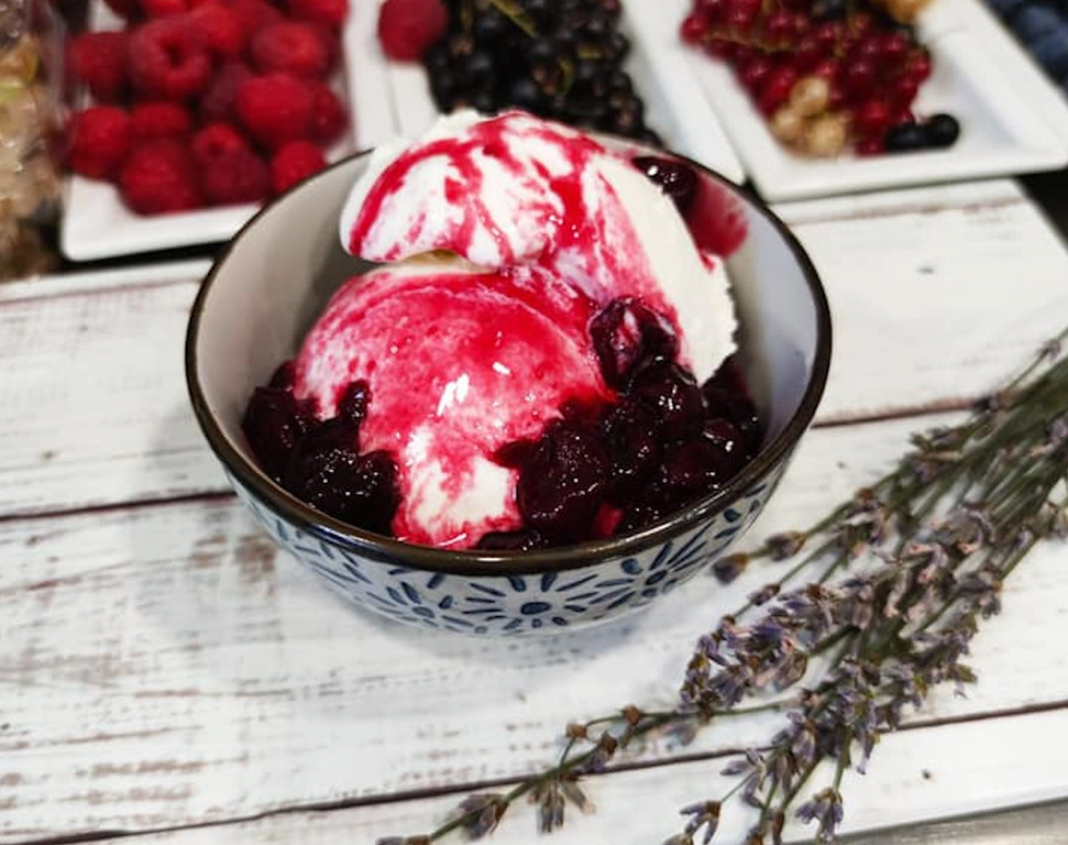 La lavanda si lascia porgere delicatamente dal fior di latte e l’amarena non la lascia più: il gusto raggiunge il suo equilibrio. Come il punto perfetto dell’estate che ci si ferma a vivere, prendendosi cura di se stessi per una manciata di minuti preziosi con un gelato, un mondo.