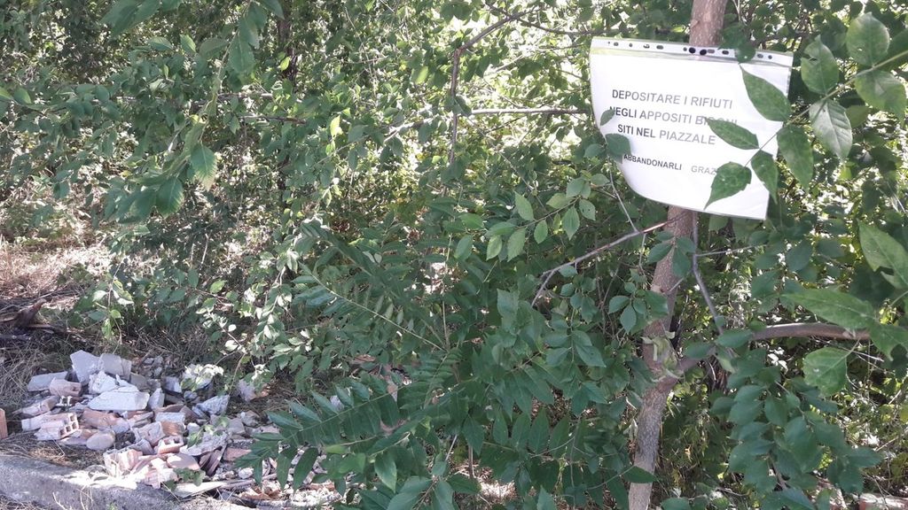 A poca distanza dai cartelli (qualcuno corredato da un’immagine che ritrae una fotocamera, a ulteriore monito) giacciono, abbandonati subito oltre il perimetro asfaltato, materiali da costruzione. Lasciati su un terreno incolto, forse privato. A qualche metro, nel parcheggio, assi, tubi e materiale ligneo. Disposti con criterio. Quasi un punto di riferimento. Beffardo, visti gli appelli a un comportamento civile disseminati nelle vicinanze.
