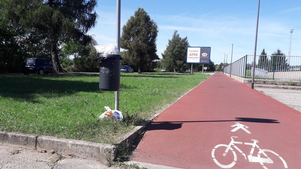 In prossimità dell’accesso all’area, immancabile il classico cestino della spazzatura che dovrebbe servire per piccoli rifiuti e colmo, invece, di immondizia domestica. Una quantità eccessiva per un contenitore del genere: una busta di troppo, lasciata a terra per mancanza di spazio, decora il sito.