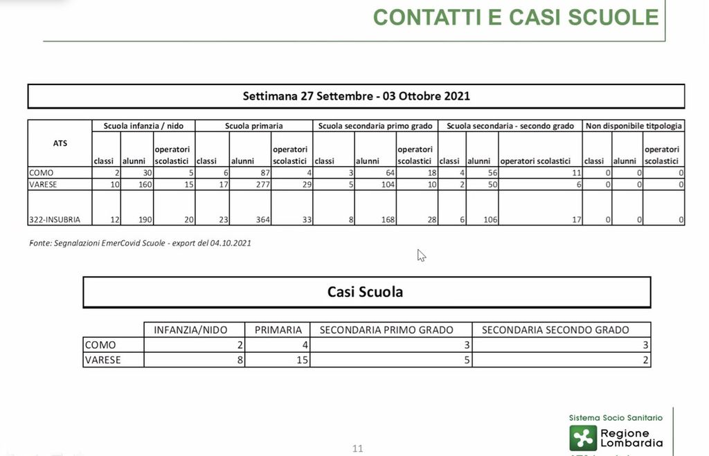 Nello specifico questa è la situazione suddivisa per tipologie di scuola. Per quanto riguarda nidi e scuole dell'infanzia, sempre tra il 27 settembre e il 3 ottobre, le classi in quarantena sono 10 (erano 22 settimana scorsa) con 160 bimbi (344 sette giorni fa), mentre gli operatori scolastici sono 15 (erano 40). Nelle primarie i bimbi in isolamento sono 277 (da 346 di settimana scorsa) con 17 classi e 29 operatori (erano 25 classi e 31 operatori).