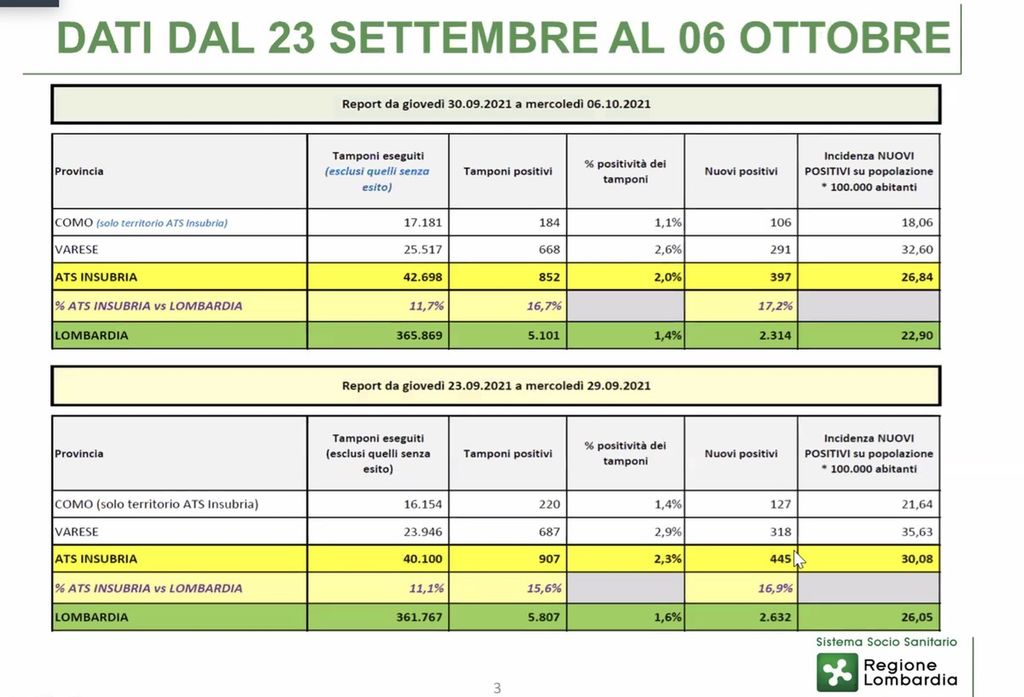 Il monitoraggio di questa settimana ha confermato una lieve frenata dei contagi. Negli ultimi sette giorni - da giovedì 30 settembre a ieri 6 ottobre - sul territorio della provincia di Varese sono stati eseguiti 25.517 tamponi che hanno individuato 291 nuovi positivi (incidenza 32,60 positivi ogni centomila abitanti). Nella settimana precedente, quella dal 23 al 29 settembre, i tamponi erano stati 23.946 con 318 casi accertati (incidenza 35,63), in quella ancora prima - tra il 16 e il 22 settembre - a fronte di 22.104 test i positivi erano stati 341 (incidenza 38,21). La curva si conferma quindi in costante discesa.