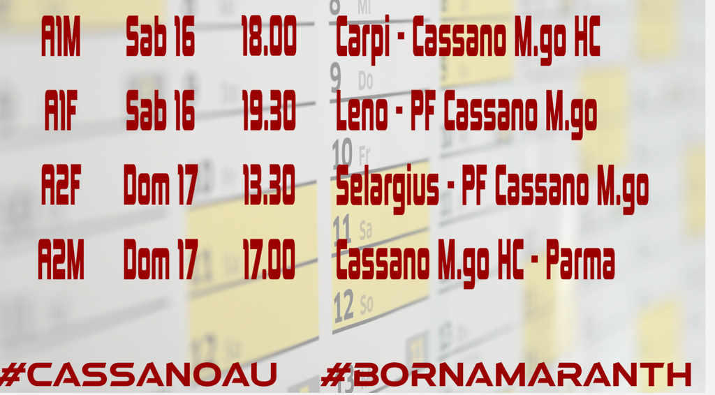 Un altro weekend di sfide per Pallamano Cassano. Si parte sabato 16 ottobre alle ore 18 in casa del Carpi per gli atleti di A1, le ragazze della stessa serie sfidano in trasferta Leno alle 19. Domenica tocca alla A2.