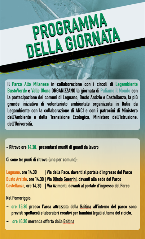 L'iniziativa nazionale, edizione italiana di Clean Up the World, è il più grande appuntamento di volontariato ambientale del mondo. È organizzata da Legambiente con i circoli di BustoVerde e Valle Olona e dal Consorzio Parco Alto Milanese con i comuni di Castellanza, Busto Arsizio e Legnano in collaborazione con la Consulta territoriale 1 dell’Oltrestazione di Legnano e la partecipazione di diverse associazioni.