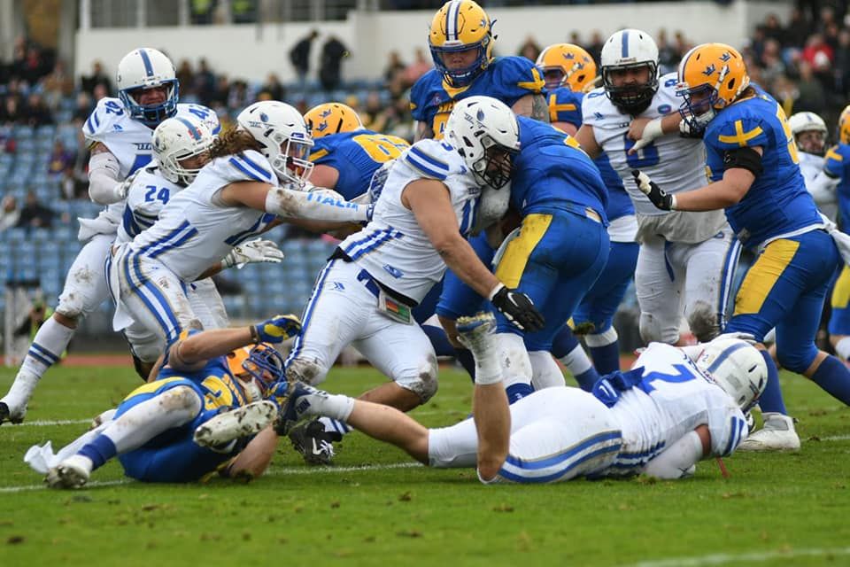 A dirigere bene i giochi il QB veterano della Nazionale Svedese, Philip Juhlin, che però vede vanificare i propri sforzi da una serie di falli che fanno arretrare il suo attacco. Non bastano 4 tentativi per provare ad andare in endzone e il reparto offensivo italiano torna in campo quando finisce il primo quarto di gioco. La Svezia è nervosa, volano le flag arbitrali in favore dell’Italia, che è ancora una volta estremamente efficace sia via terra che per le vie aeree e varca per la terza volta l’endzone degli svedesi con Simone Alinovi. Questa volta Felli è preciso tra i pali: 20 a 0