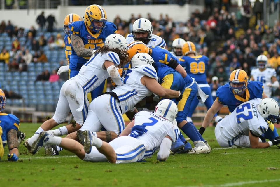 La Svezia ci prova, ma la difesa azzurra non concede nulla. Al primo snap italiano, però, Simone Alinovi riceve e poi perde la palla nell’impatto contro il difensore, recuperata dagli svedesi per il primo turnover della partita. Prendono coraggio gli svedesi, che adesso sfruttano il momentum per macinare gioco ed entrare nella metà campo avversaria.