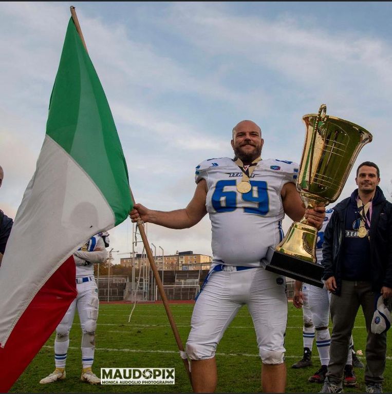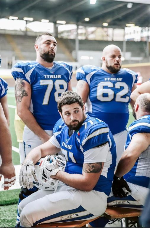 Anzi, il suo percorso nel football americano l'ha portato in nazionale e al titolo continentale, grazie alle insistenze di un amico, Domenico Caroli (nelle foto sotto col numero 78), che l'ha convinto a dichiararsi eleggibile per un raduno della nazionale a Modena, nel 2018. «Non ci volevo andare perché mi sentivo inferiore agli altri, è stato lui a convincermi. L'ho ascoltato ed effettivamente mi sono guadagnato il posto. Ho giocato le mie partite da titolare in questo campionato europeo, contro Austria e Svizzera pure insieme a Domenico. Anche in finale ho dato il mio contributo». Un'amicizia nata sul campo da football, nell'esperienza comune ai Seamen Milano fino all'anno scorso, giorno dopo giorno, partita dopo partita.