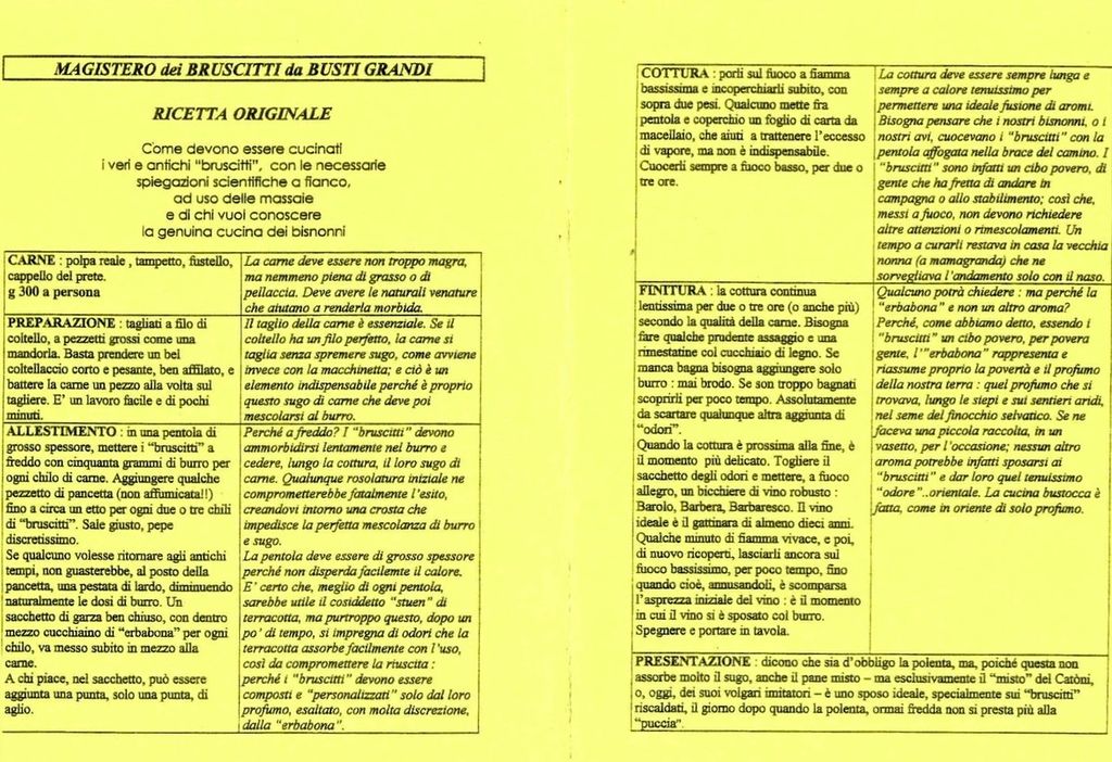 Viaggio mensile, accompagnati dal Magistero dei Bruscitti, nelle ricette e nei piatti di ieri, più attuali e apprezzati che mai, con la Confraternita fondata da Bruno Grampa nel novembre del 1975. Obiettivo di allora, creare un sodalizio che salvasse, valorizzasse e diffondesse la conoscenza della tradizione della cucina bustocca.