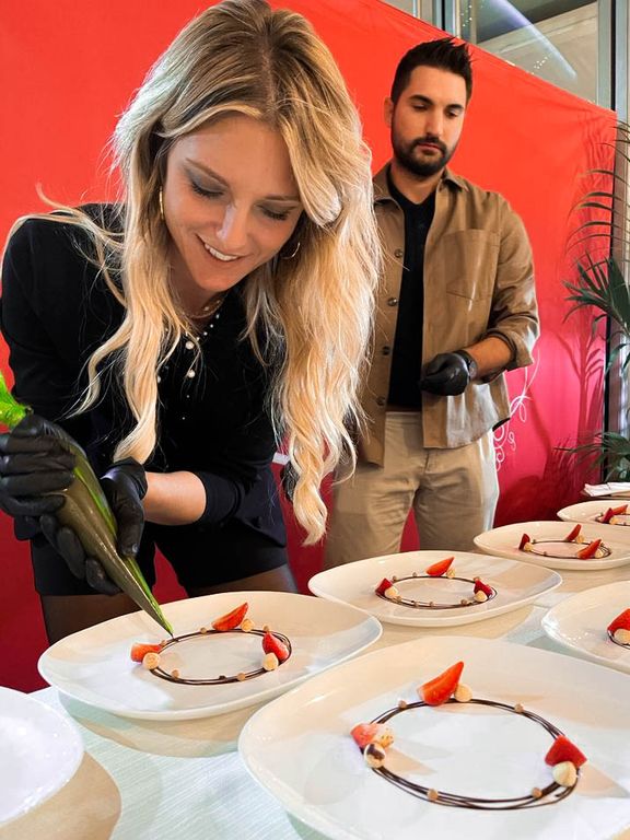 Invitata dal titolare di Sapori d’Italia, Giuseppe Cuteri, la pasticcera di Gallarate ha proposto un prelibato dessert composto da una base di sucrée alla nocciola, biscuit alla vaniglia, salsa al caramello salato e una mousse fondente al 60%. L’evento proposto dai due giovani, under 35, riflette la rispettiva passione per l’arte culinaria, pasticceria e ristorazione, attraverso l’incontro tra la semplicità della tradizione e l’innovazione tipica delle nuove generazioni.