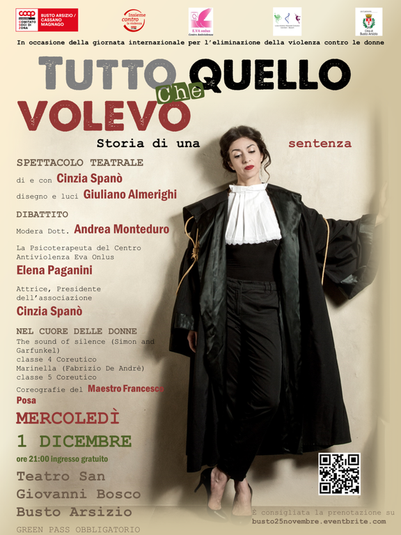 Il Comitato Soci di Busto Arsizio-Cassano Magnago, il Liceo Artistico e Coreutico e il Centro Antiviolenza Eva Onlus organizzano, in occasione della Giornata Internazionale per l’eliminazione della violenza contro le donne, l’evento teatrale “Tutto quello che volevo - storia di una sentenza” di e con Cinzia Spanò. Si esibiranno i ragazzi e le ragazze dell'indirizzo contemporaneo del Liceo Coreutico Bausch di Busto Arsizio, su coreografie del maestro Francesco Posa. Seguirà tavola rotonda.