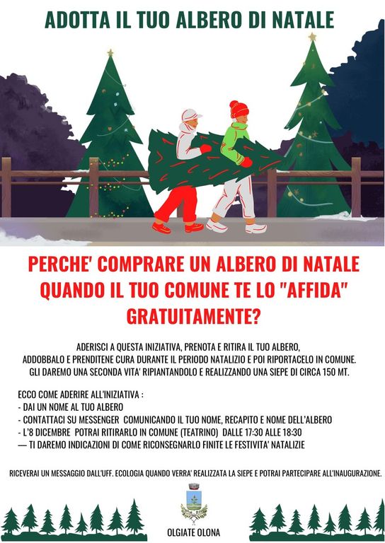 «Perché comprare un albero che con tutta probabilità sarà gettato alla fine delle feste quando potresti prenderne in affido uno che dopo l’Epifania sarà usato per abbellire il tuo paese?». È da questa domanda che parte la nuova iniziativa “Adotta un albero di Natale”, realizzata dal Comune di Olgiate che intende coinvolgere i negozianti e i cittadini in un progetto speciale. Tappa finale, la realizzazione di una nuova siepe di circa 150 metri in uno spazio verde.