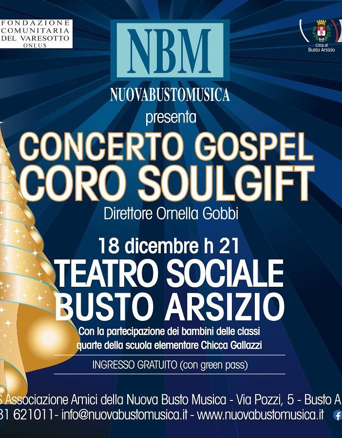 L'evento è organizzato dalla Nuova Busto Musica. Il coro Soulgift è nato all’interno della NBM ed è interamente formato da musicisti e cantanti professionisti. Da trent'anni rende il Natale della città di Busto ancora più emozionante e musicale. «Vi aspettiamo numerosi – dice Ornella Gobbi –. Dopo la pausa forzata dell'anno scorso, abbiamo ancora più voglia di cantare e sentire il calore del pubblico». Tra l'altro, in una “formazione” del tutto speciale per vivere l'incanto della festa. L'ingresso al teatro è gratuito e possibile solo con “green pass”.