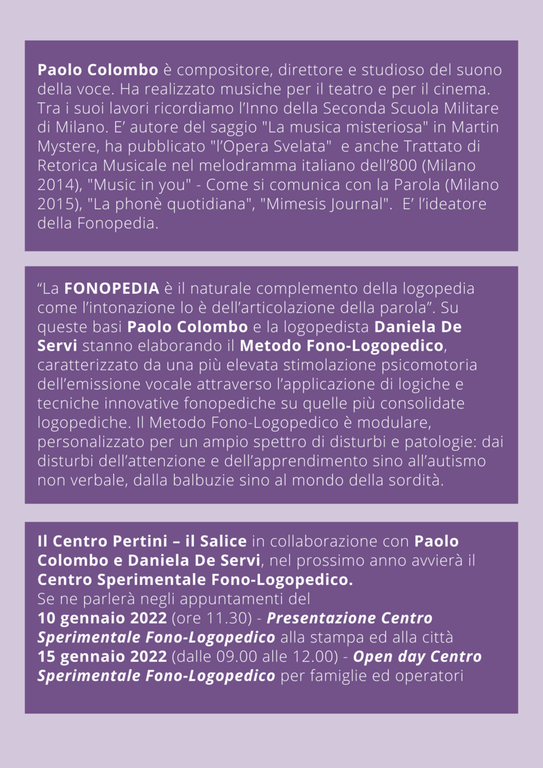 Emilia Calini, responsabile del “Centro Pertini - il Salice” di Legnano, ha presentato martedì 11 gennaio una nuova iniziativa che prende l’avvio in questo inizio di 2022: il Centro Sperimentale Fono-Logopedico. È la prima volta che il “Pertini” si spinge ai limiti dell’area sanitaria, ma la proposta/sfida di Paolo Colombo e Daniela De Servi non poteva che essere accettata.