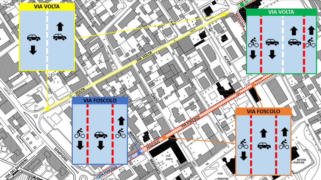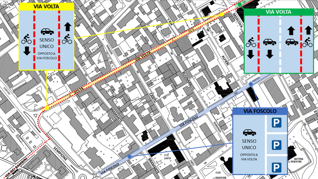 Venendo alle due opzioni di percorso (nelle foto allegate), il passaggio in via Volta (foto 1) della Bicipolitana la trasformerebbe in un senso unico (ancora da decidere la direzione del senso di marcia) nel tratto Corso Sempione-Via Moscova per lasciare spazio a due corsie ciclabili, una per senso di marcia. Conseguenze di questa scelta sarebbero il dirottamento di parte del traffico veicolare sulle vie limitrofe, tra cui via Foscolo, che diventerebbe a senso unico con direzione di marcia opposta a via Volta, e la revisione della circolazione delle traverse delle vie Volta e Foscolo.