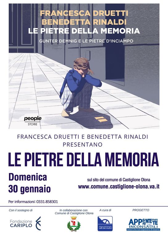 Il Sistema Bibliotecario Valli dei Mulini, nell’ambito del progetto “Apparentemente inconsapevoli: lettori che sapevano di esserlo”, presenta l'incontro con le scrittrici Francesca Druetti e Benedetta Rinaldi, autrici del libro “Le pietre della memoria. Gunter Demnig e le pietre d'inciampo”, edito da People.