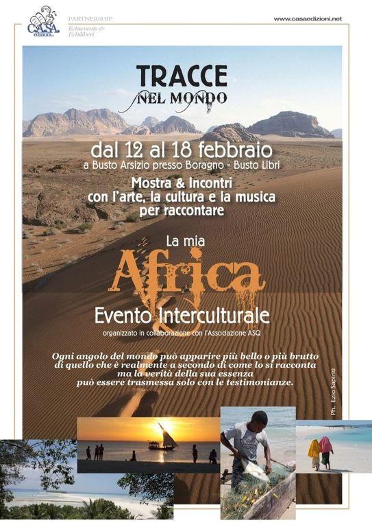 Da sabato 12 a venerdì 18 febbraio la Galleria Boragno ospiterà dunque “Tracce nel mondo - La mia Africa”, evento interculturale organizzato da C.A.Sa. Edizioni e Tracce nel Mondo Onlus in collaborazione con l'associazione ASQ: una rassegna di mostre e incontri per raccontare l'Africa attraverso l'arte, la cultura, la musica, le esperienze, le testimonianze e i gesti d'amore.