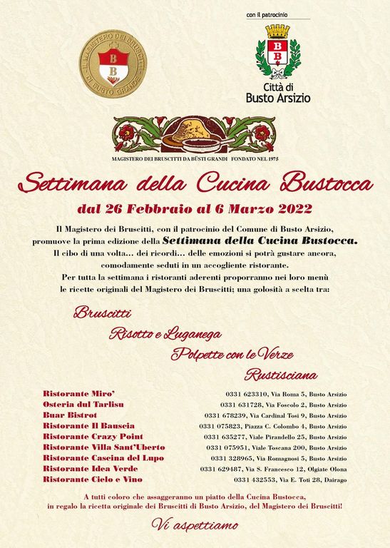 Dal 26 febbraio al 6 marzo, il Magistero dei Bruscitti, con il patrocinio del Comune di Busto Arsizio, promuove la prima edizione della Settimana della Cucina Bustocca per conservare le tradizioni e la cultura culinaria del territorio. Tra i nove ristoranti di Busto e dei comuni limitrofi che hanno aderito alla proposta del Magistero dei Bruscitti spicca sicuramente il Ristorante Idea Verde di Olgiate Olona, un ristorante che basa la propria cucina da oltre 30 anni, principalmente sul pesce, ma offre valide alternative per tutti i palati.