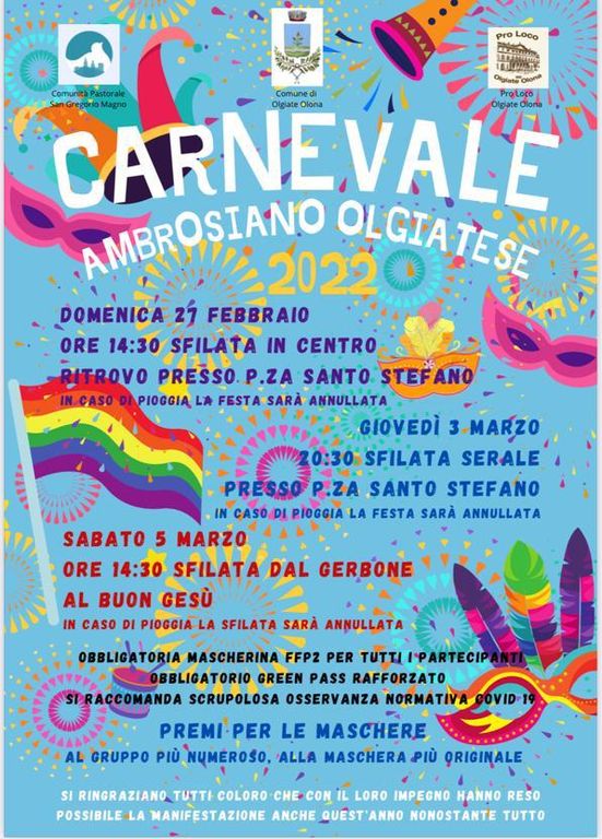 Non mancheranno, inoltre, i tradizionali appuntamenti con i premi per le maschere più originali e per il gruppo più numeroso, assegnati dalla Pro Loco olgiatese. In caso di pioggia le feste saranno annullate.