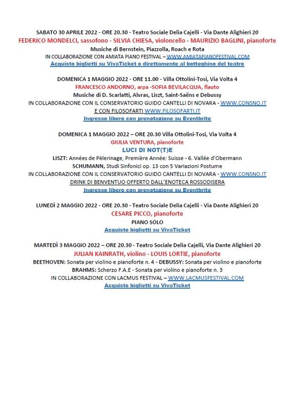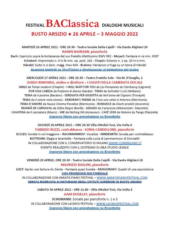 Ad animare le giornate che vanno dal 26 aprile al 3 maggio saranno dieci concerti. Protagonisti alcuni artisti che hanno deciso di rinnovare la loro presenza a Busto, affiancati da giovani di grande talento che per la prima volta saranno ospitati da BA Classica.