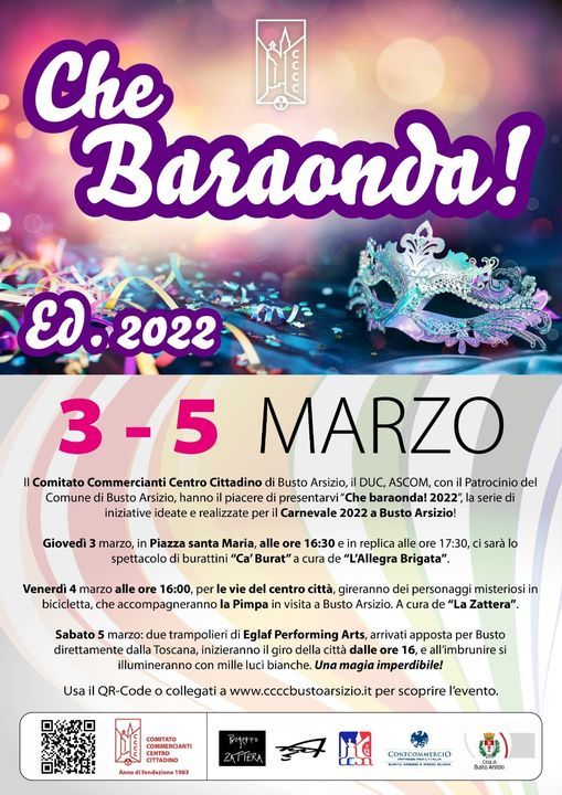 In occasione del Carnevale di Busto Arsizio, il Comitato Commercianti Centro Cittadino, in collaborazione con Associazione Commercianti Confcommercio e Distretto Urbano del Commercio, organizza “Che Baraonda!”, una serie di eventi dedicati ai bambini.