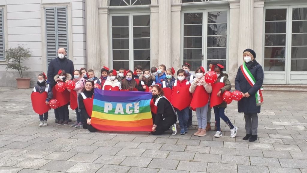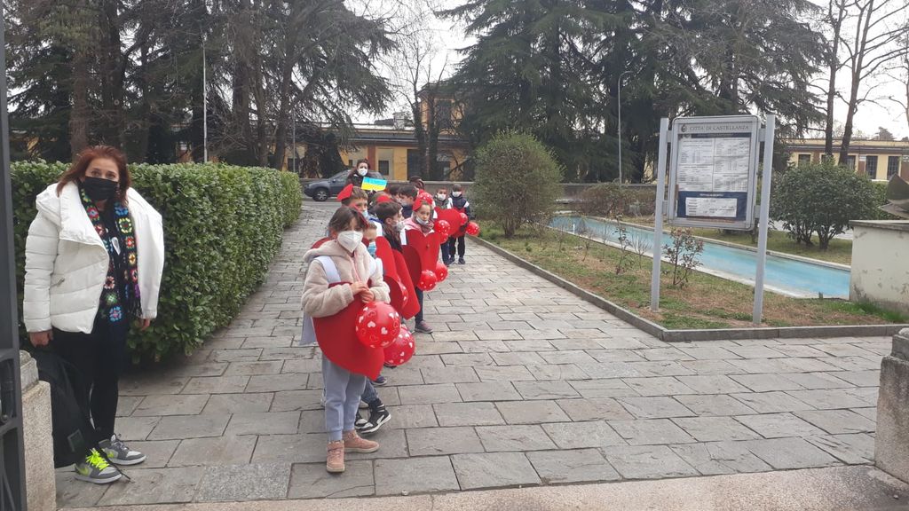 I bambini, vestiti come se fossero piccoli (grandi) cuori per testimoniare la necessità di diffondere più amore possibile nel mondo, hanno raggiunto a piedi il Comune tenendo in mano e sventolando alcune bandierine dell’Ucraina, facendosi notare e apprezzare anche da chi li ha visti camminare per le vie cittadine.