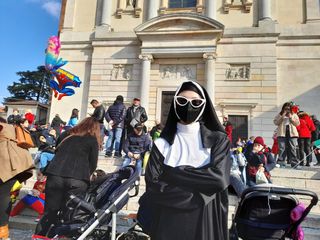 In piazza, Fabio tiene in braccio una giovanissima Minnie. Accetta, sorridente, che l’altra figlia dialoghi col cronista. Suor Iris, 13 anni, osserva: «Oggi è una bella giornata. Ci sono bambini che non hanno partecipato a nessun carnevale. O non se lo ricordano, il carnevale, erano troppo piccoli».