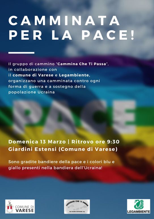 «Dobbiamo far sentire forte la nostra voce e unirci al movimento che sta condannando senza se e senza ogni tipo di guerra». Per questo domenica 13 marzo il gruppo di cammino “Cammina che ti passa”, in collaborazione con il Comune di Varese e Legambiente, organizza una passeggiata per la pace e per esprimere il proprio sostegno alla popolazione ucraina. L’appuntamento alle 9.30 ai Giardini di Palazzo Estense a Varese.