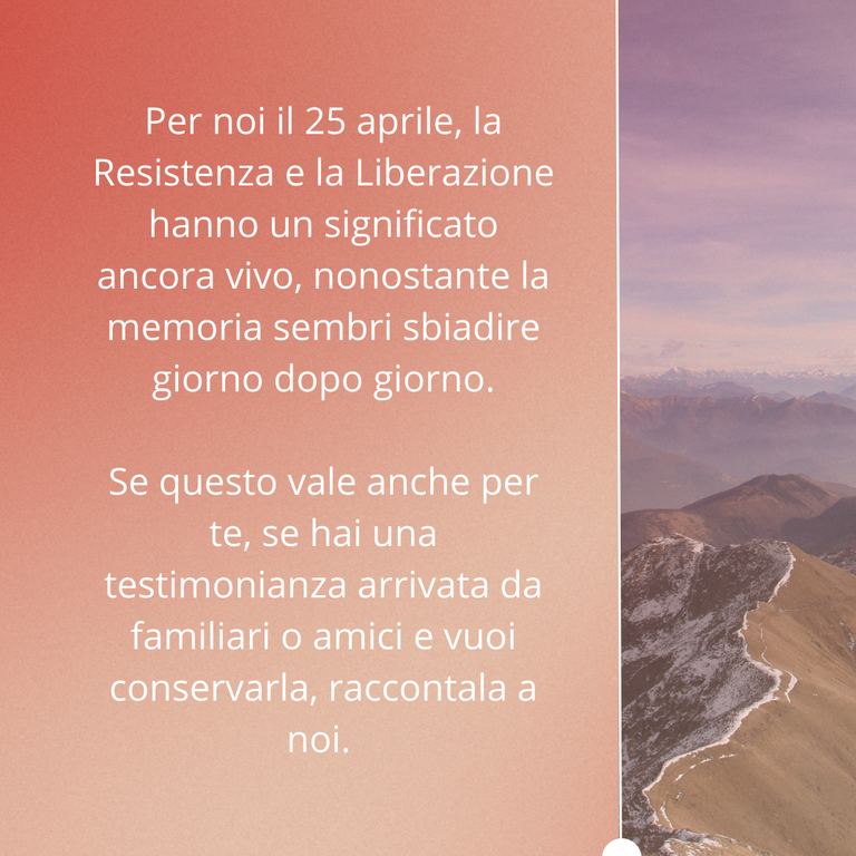 L'obiettivo: «Creare un piccolo archivio dal basso, asistematico e spontaneo, con voci ed esperienze diverse, che racconti cosa siano Resistenza e 25 Aprile a chi non li ha vissuti ma crede in ciò che hanno rappresentato e continuano a rappresentare. Cerchiamo quindi racconti personali, familiari, tramandati, ma anche immagini con un testo o una descrizione.