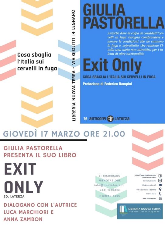 Giovedì 17 marzo, alle ore 21, alla libreria Nuova Terra di Legnano (via Giolitti, 14) Giulia Pastorella presenta il suo libro “Exit Only” (ed. Laterza) in dialogo con Luca Marchiori e Anna Zambon.